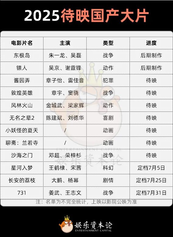 娱乐资本论查阅一番,目前待映/制作中的国产大片有《东极岛》《镖人》《731》等,列表如下,希望它们之中能够冲出多部爆款电影,带动整个市场向上向好,打破产业困局。