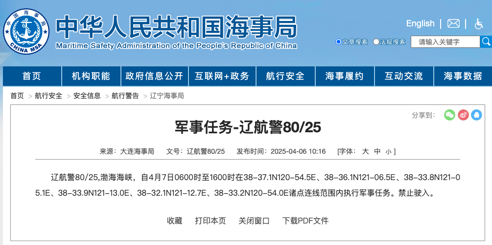 据中国海事局网站消息,大连海事局发布航行警告,4月7日6时至16时,渤海海峡部分海域执行军事任务,禁止驶入。