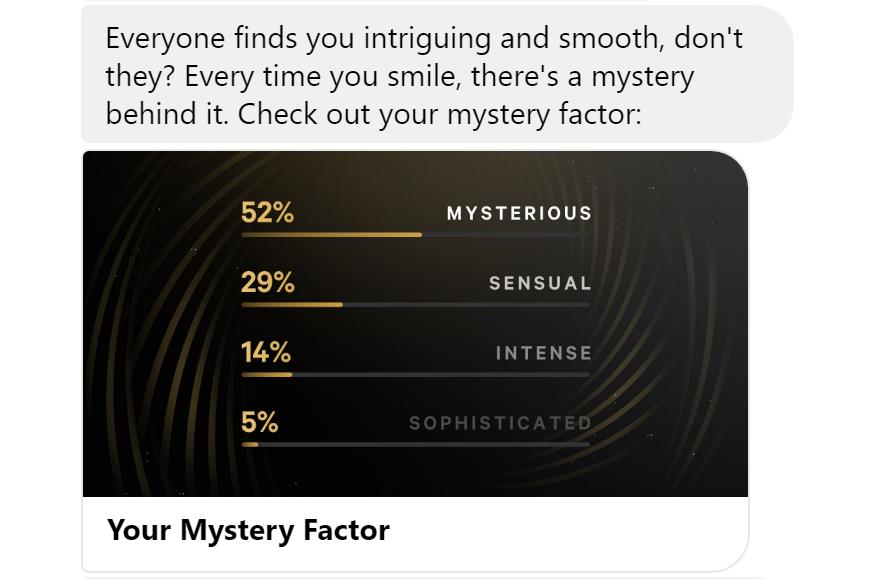 虽然不清楚它是用什么依据来评价你的声音的,但机器人会给你发回一个类似心理测试一样,对每个人都适用的结论(比如我就是迷人、温暖,笑起来会有神秘感),以及一个看似很科学很唬人的数据图。