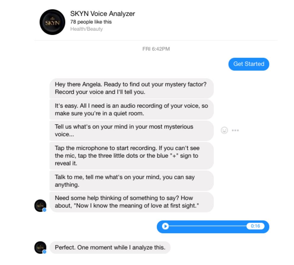 最近,安全套品牌极肤(SKYN)在Facebook Messenger上推出了一个聊天机器人,能从性感度、神秘度、情感强度和成熟度四个方面评判你的声音。你只需要在Facebook Messenger上找到SKYN Voice Analyzer,在提示后发送一段语音过去即可,这个机器人不仅可以区分男性和女性的声音,还可以理解多种语言,包括英语,意大利语,法语,葡萄牙语和波兰语。