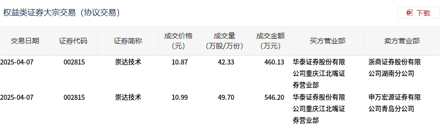4月7日,崇达技术大宗交易成交92.03万股,成交额1006.33万元,占当日总成交额的7.4%,成交均价10.93元,较市场收盘价9.58元溢价14.14%,其中最高成交价10.99元,最低成交价10.87元。
