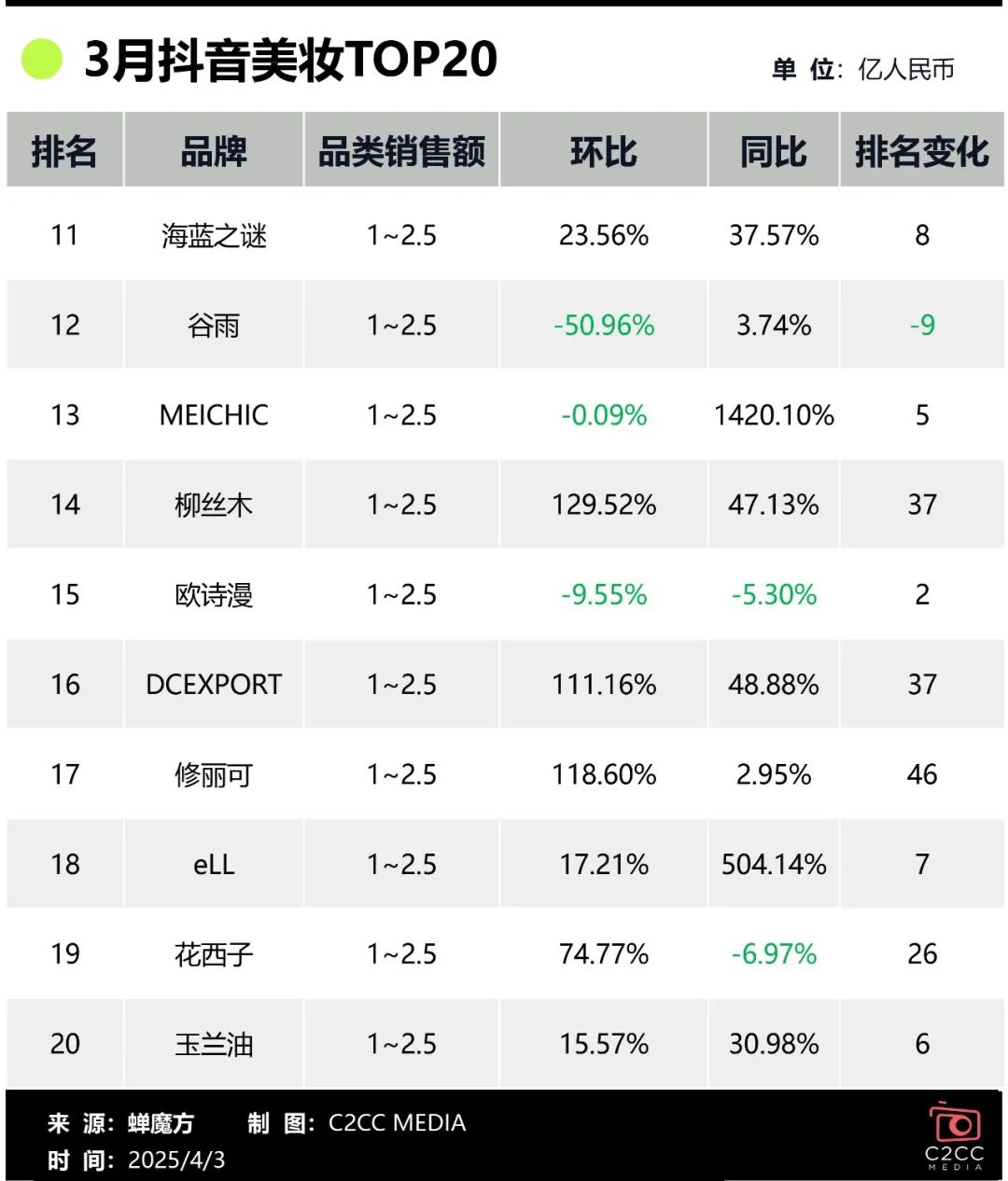 不过,彩妆品牌的具体构成发生了变化。3月上榜的彩妆品牌为eLL和花西子,而2月则是毛戈平和圣罗兰。另外,3月上榜的2个彩妆品牌在榜单中处于末尾位置,而在2月毛戈平挤进TOP10。
