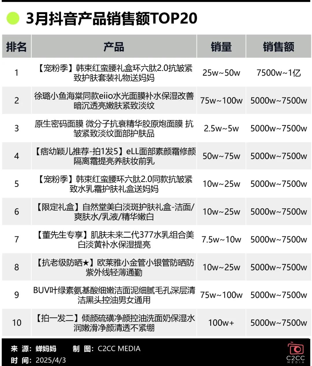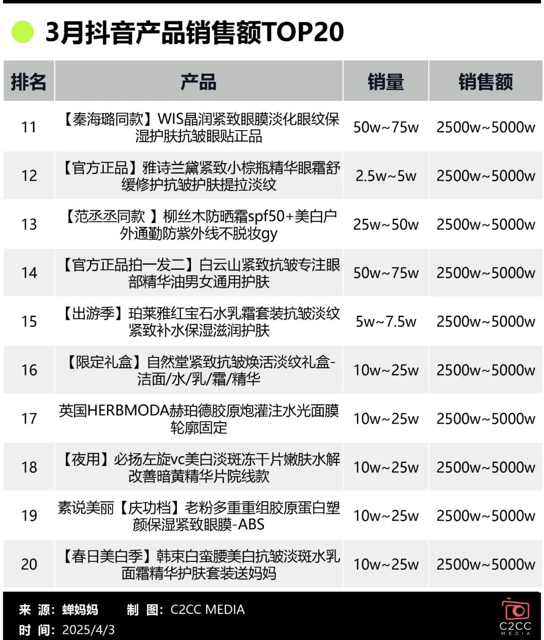 抖音美妆产品销售额TOP20,TOP5中3个白牌产品上榜