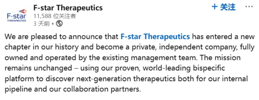 此前,2023年3月,中国生物制药通过Invox完成对F-star的收购。2025年4月4日,F-star则在领英平台宣布,F-star Therapeutics已进入新篇章,成为一家私营、独立的公司,由现有管理团队全资拥有和运营。