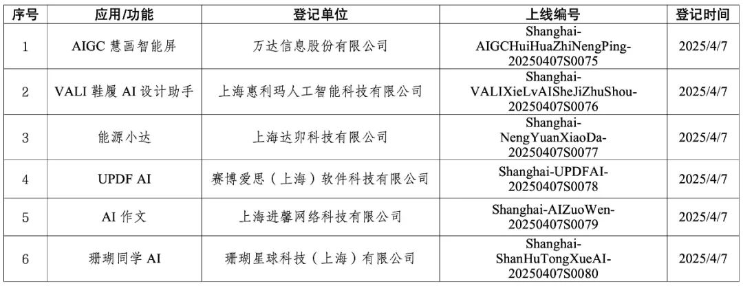 上海市新增6款已完成登记的生成式人工智能服务