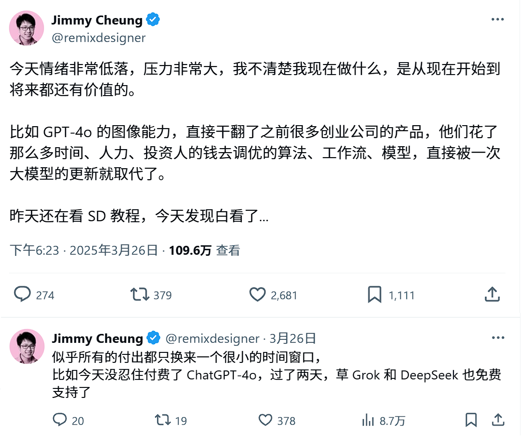 在GPT-4o图像能力升级之后,一条流传很广的推文写道,这直接干翻了之前很多创业公司的产品,他们花了那么多时间、人力、投资人的钱去调优的算法、工作流、模型,直接被一次大模型的更新就取代了。他写道,“今天情绪非常低落,压力非常大,我不清楚我现在做什么,是从现在开始到将来都还有价值的。”