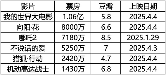 从数据角度来看,今年清明档票房冠军当属引进片《我的世界大电影》,影片在北美乃至全世界都迎来大爆开局,北美更是开出了1.57亿美元的惊人成绩,拿到游戏改编北美历史第一的位置。全球层面豪取3.01亿美元开画,拿到游戏改编历史第二。其中内地市场拥有不错的加持。