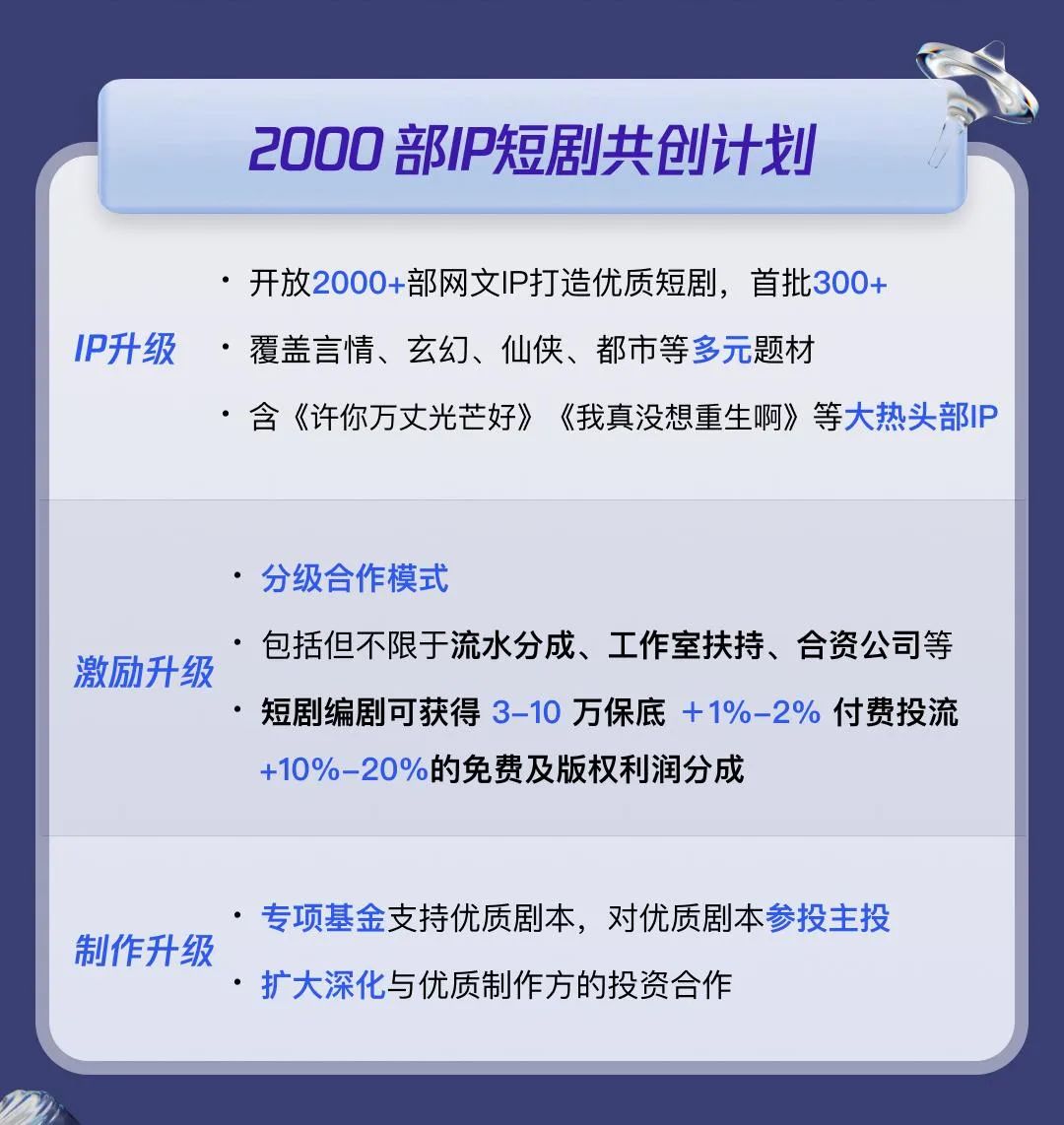 针对此次推出的超过2000个IP后续开发,阅文短剧推出了“保底+分成+股权”的立体激励机制。优质编剧可获得3万至10万元的创作保底金,叠加1%-2%的付费投流分成及10%-20%的免费内容收益分成。此外,阅文方面还会为顶级创作者提供工作室孵化、合资公司共建等多元激励。