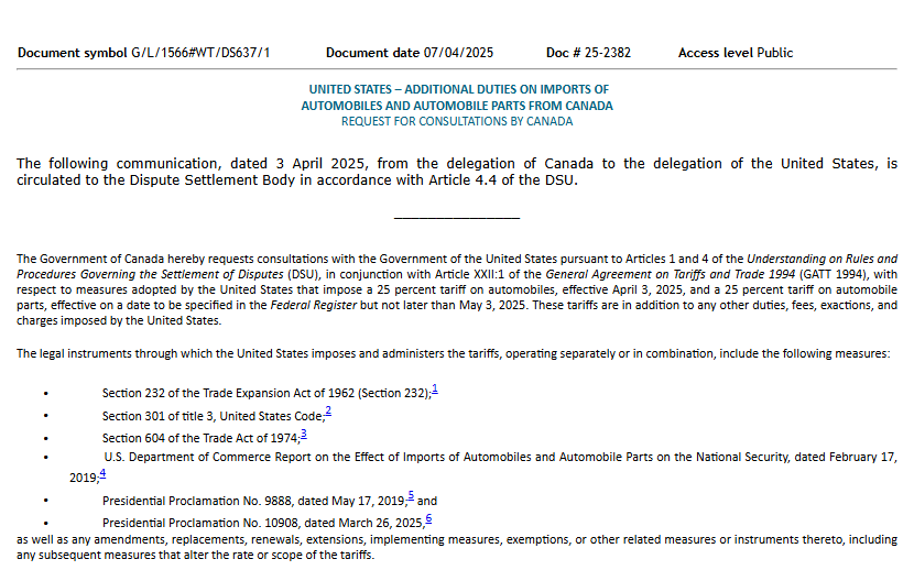4月7日,根据世界贸易组织(WTO)网站发布的一份文件显示,加拿大已就美国对汽车和汽车零部件征收25%的关税措施向世贸组织提出争端申诉。