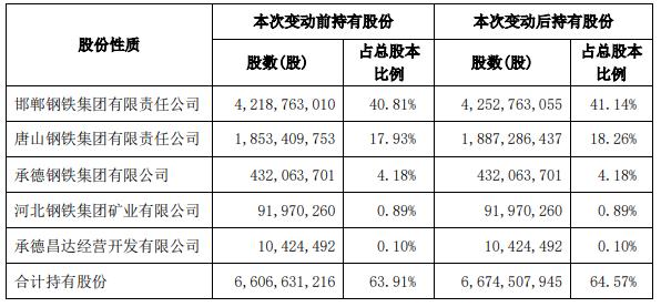 本次增持后,邯钢公司共持有4,252,763,055股,占公司总股本的41.14%;唐钢公司共持有1,887,286,437股,占公司总股本的18.26%。