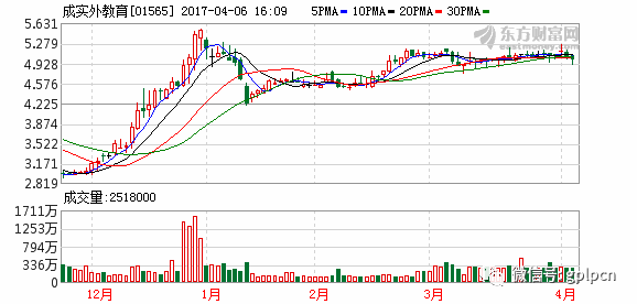 2017年3月17日,在各大上市公司哀鸿遍野之际,专注K12的教育股突然拉升暴涨,貌似解释了学区房的问题,买不起学区房可以买教育股,而且从业绩方面来说,各大公司也普遍交出了漂亮的业绩,在业绩及政策利好的双重刺激之下,教育股一齐暴涨——以成实外为例(由于历史原因,专注K12的民办教育股大多登陆香港的资本市场):