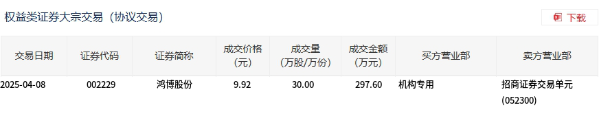 4月8日,鸿博股份大宗交易成交30万股,成交额297.6万元,占当日总成交额的0.99%,成交价9.92元,较市场收盘价9.92元持平。