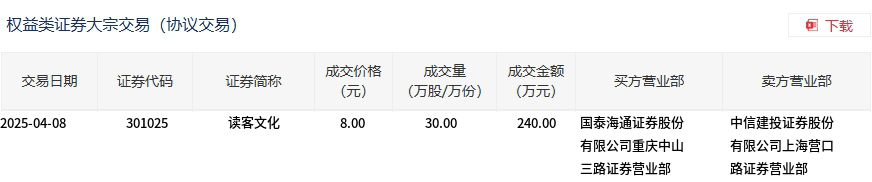 读客文化今日大宗交易折价成交30万股,成交额240万元
