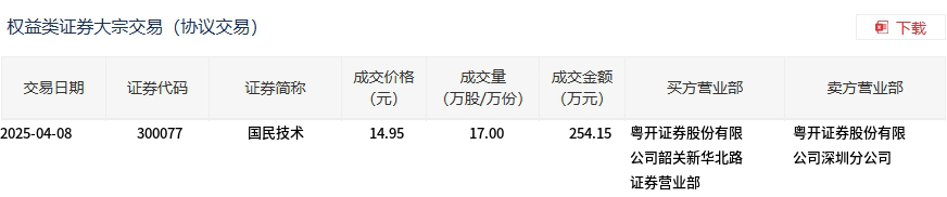 4月8日,国民技术大宗交易成交17万股,成交额254.15万元,占当日总成交额的0.25%,成交价14.95元,较市场收盘价19.88元折价24.8%。