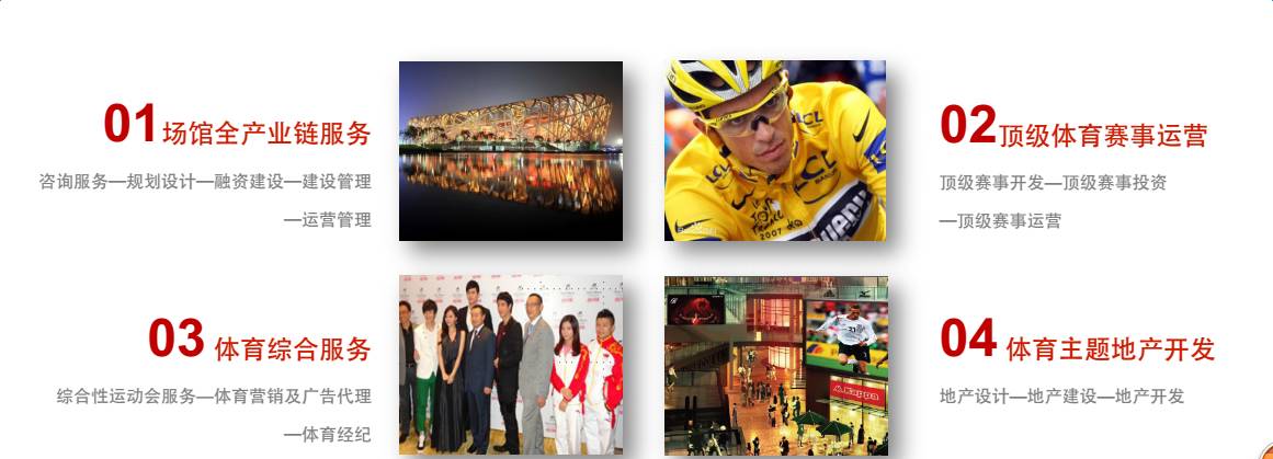 在体育综合服务方面,中体产业提供城市、企业体育营销、综合性运动会服务、票务服务与体育经纪。此外,中体产业是中国城市体育地产领跑者,业务涵盖住宅地产、中央体育商务区、体育商业地产、体育养生地产、体育休闲地产五大城市地产领域,地产项目现已遍布全国4个直辖市、19个省。