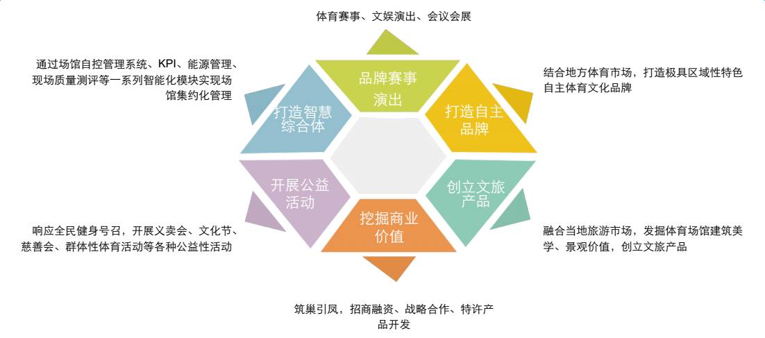 中体在运动城项目中,采用了“多元化”运营模式,以多元化经营模式破解体育场馆利用率低、开放程度不足的问题;并将品牌赛事演出、打造智慧综合体、开展公益活动、挖掘商业价值、创立文旅产品、打造自主品牌等功能合而为一,打造集休闲、娱乐、餐饮、文化、健康、运动、商务为一体的家庭体验式文化体育服务综合体。并从可控化、可量化、自动化、可视化四个角度打造智能化体育场馆。充分发挥互联网功能、以场馆为核心,带动体育电商、体育旅游、体育会展、体育科技、体育医疗、体育传媒、体育培训与赛事活动。