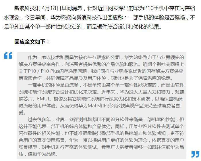2017年4月18日,新浪科技消息称,华为终端针对此事向新浪科技作出了回应:一部手机的体验是否流畅,不是单纯由某个单一部件性能能决定的,而是硬件综合设计和优化的结果。回应全文内容如下图。