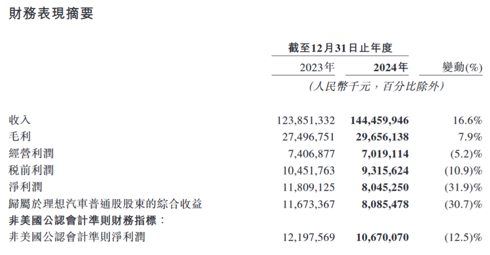 理想2024年营业收入为1445亿元,同比增长16.6%,连续两年全年营收突破千亿元。