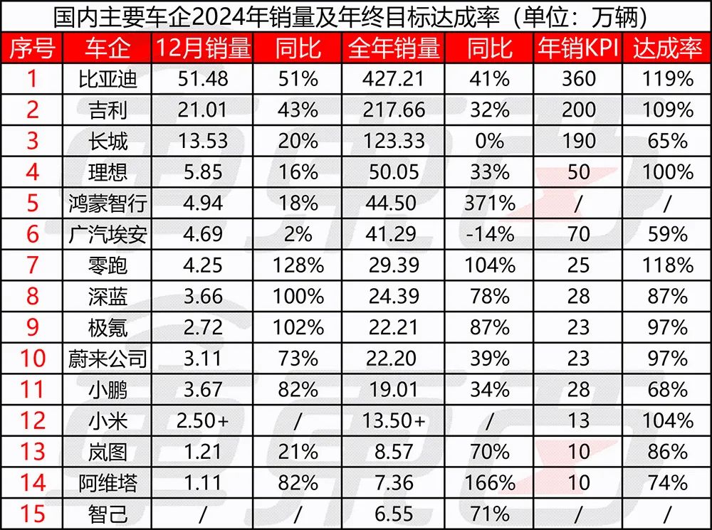 比亚迪、零跑、小米提前完成年销,全年卖车超427万台、超29万台、超13.6万台,年销目标达成率为119%、118%、104%。比亚迪更是比2024年销量目标多卖车67万台。