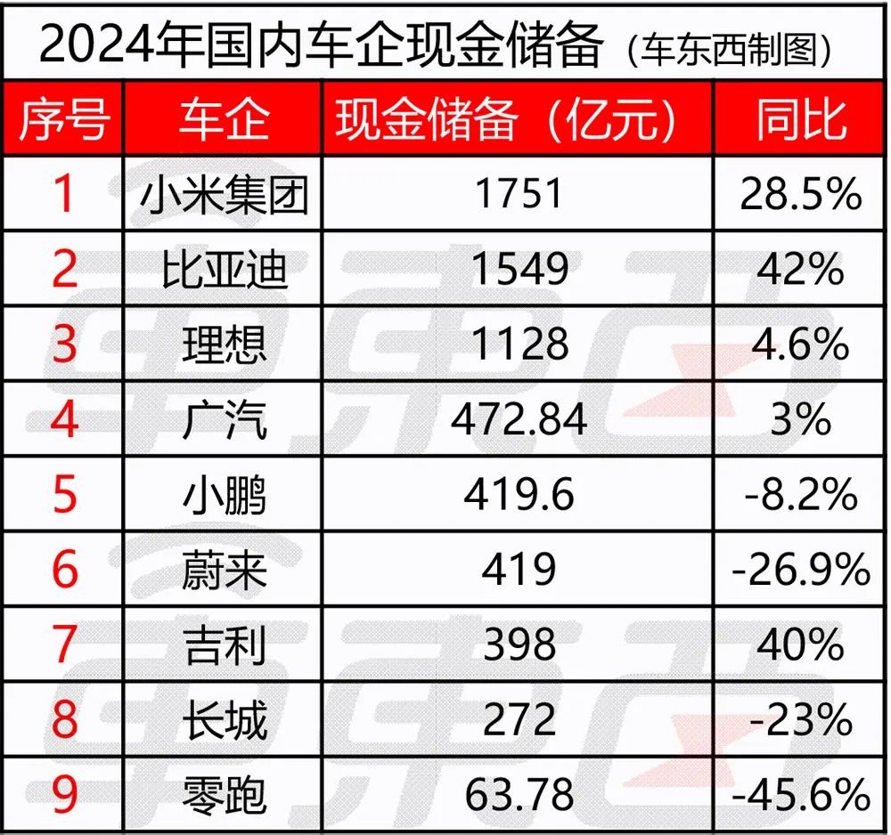 现金储备方面,比亚迪、理想、小米集团仍然手握千亿现金,现金储备分别为1549、1128、1751亿元,相较前一年均呈现增长,比亚迪现金储备同比增长幅度高达42%。