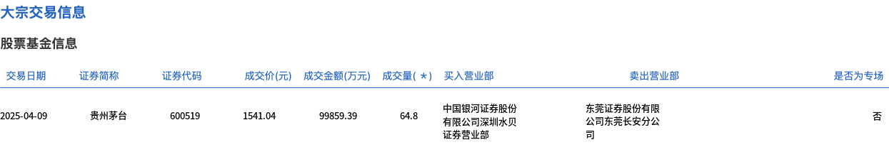 贵州茅台今日大宗交易平价成交64.8万股,成交额9.99亿元