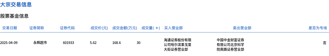 永辉超市今日大宗交易折价成交30万股,成交额168.6万元