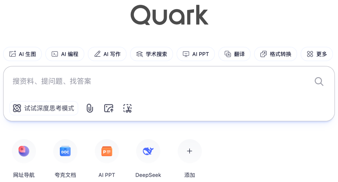 所谓的“AI超级框”,是指一个入口就能满足用户的AI搜索、AI对话以及AI PPT、AI翻译、AI生图等不同需求。目前带头的参赛玩家是阿里和百度,它们的打法也很有意思,两大巨头不约而同将旗下“旧将”——阿里夸克和百度文库推向前线。