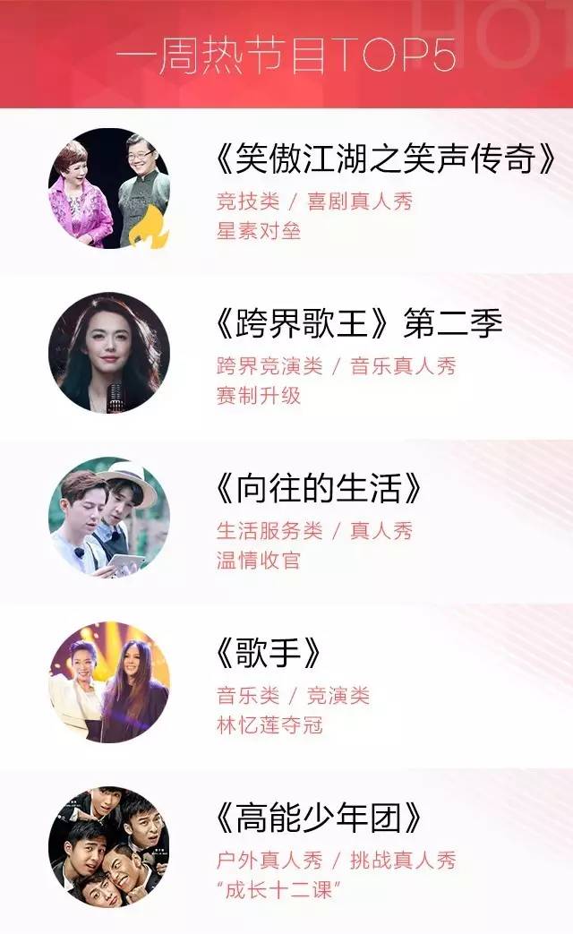 上周,热播节目依然集中在周末黄金档,TOP5被真人秀包揽。湖南卫视《向往的生活》收官,送走蘑菇屋客人谢娜、赵丽颖之后,H4依依惜别,被网友称为“最温情的节目”。此外,音乐竞技类节目《歌手》迎来决赛之夜,林忆莲在帮帮唱嘉宾张惠妹的助阵下,夺得本季冠军;《高能少年团》开启第三节“体育课”,张一山携同兄弟团与“辣肉队”进行PK,圈粉不少。