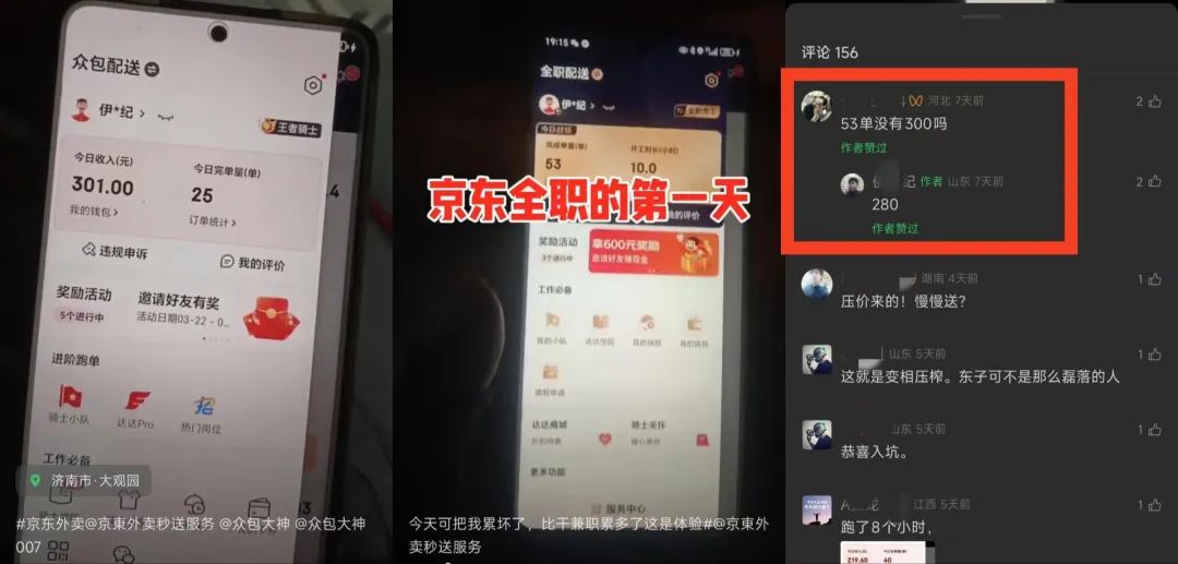 对此,一位刚刚从众包转为全职的京东骑手,专门发视频对比了入职前后的收入:跑众包时,一天25单收入300元;成为全职后,第一天跑了53单,收入不到300元。如果全职的代价是单价腰斩、工时翻倍,谁还敢要免费的五险一金?
