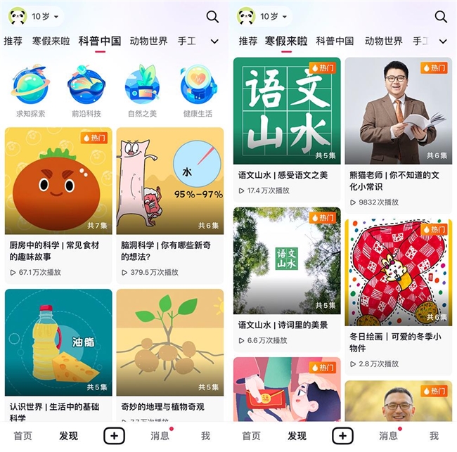 图:某短视频平台的青少年模式提供了丰富的知识内容