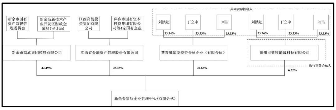 据“野马财经”查询,金紫欣为有限合伙企业,新余高欣、江西金资、共青城紫能共同担任其有限合伙人,出资比例分别为42.49%、28.33%、22.66%;滁州紫锳担任其普通合伙人和执行事务合伙人,出资比例为6.52%。其中,共青城紫能和滁州紫锳的共同实控人均为刘洪超、丁立中、刘浩基。