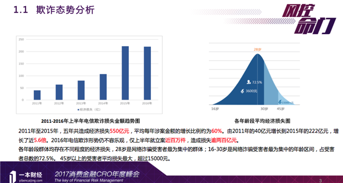 “2011年至2015年,五年共造成经济损失550亿元,” 通付盾创始人董事长兼CEO汪德嘉,在一本财经举办的“2017消费金融CRO全球峰会”上称,看看中国黑产的规模,就知道反欺诈有多难。