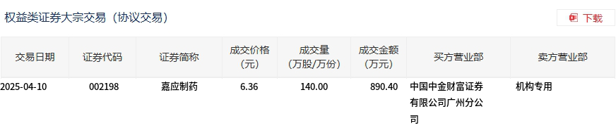 嘉应制药今日大宗交易平价成交140万股,成交额890.4万元