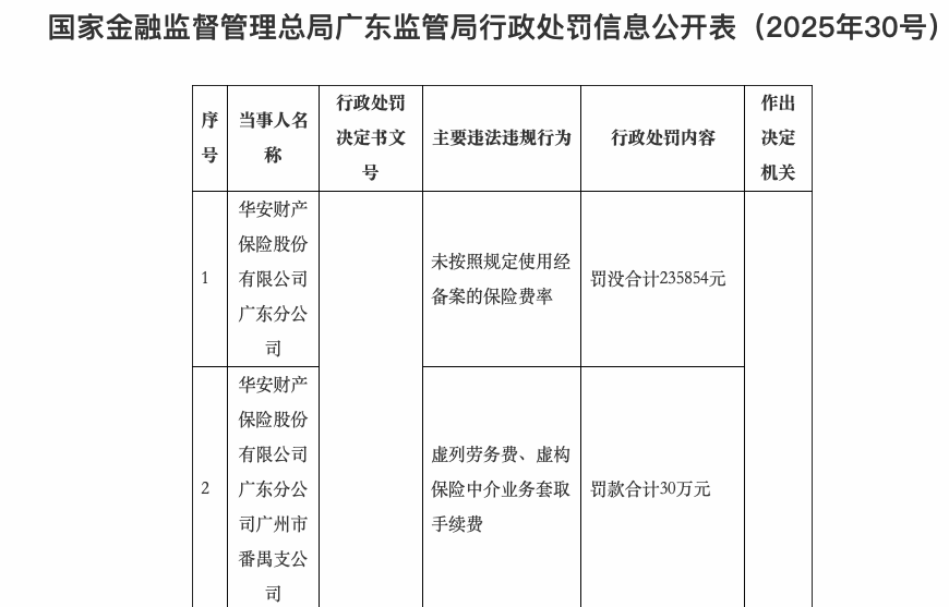 而华安保险广东分公司旗下广州市番禺支公司因虚列劳务费、虚构保险中介业务套取手续费被罚款30万元,时任总经理朱文杰被警告并罚款5万元。