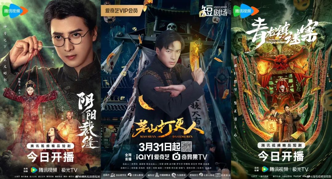 2025年,横屏短剧最奇异的发展就是“文艺复兴”了网络电影,腾、爱都冒出不少民俗惊悚题材短剧——《阴阳裁缝》《青龙镇秘案》《茅山打更人》,从海报到剧名都网大既视感十足。其中由长剧演员应昊茗(也出演过不少网大)主演的《阴阳裁缝》成绩相当不错,登上云合3月短剧霸屏榜第二位。