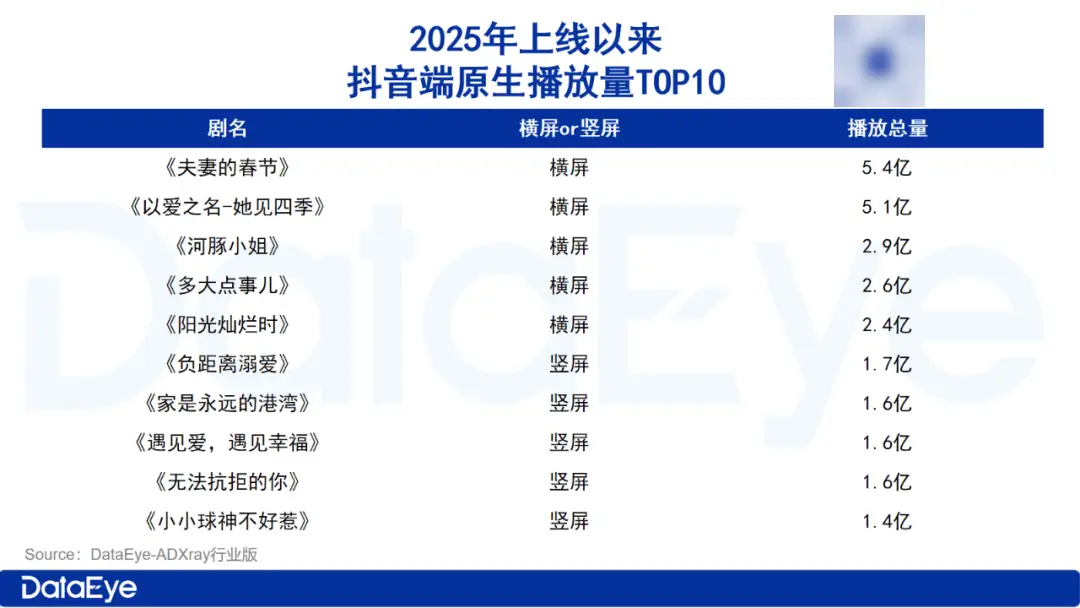 抖音短剧也并不执着于竖屏。据统计,2025年上线的抖音端原生播放量TOP10的短剧中,TOP5由横屏短剧包揽。