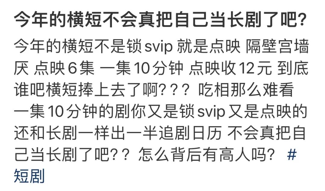 更重要的是,许多横屏短剧并非像竖短一样一次性放出全集,而是像长剧一样需要追更,甚至于2025年起还设置了结局会员点映。如此种种,都被短剧爱好者直斥“忘本”——追更摧毁了刷短剧的爽感,人家短剧观众也没有记住前面剧情等更新的习惯。