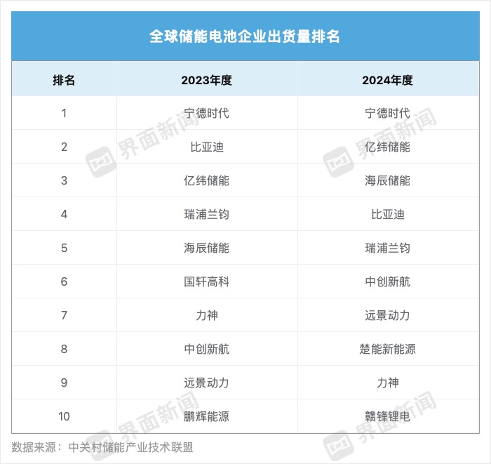 去年全球储能电池企业中,宁德时代(300750.SZ)出货量稳居第一;亿纬储能(300014.SZ)跃升一位至第二;海辰储能从第五名升至第三。比亚迪(002594.SZ)的储能电池出货量在去年降至第四,排名同比下降两位;瑞浦兰钧(00666.HK)下降一位,至第五。