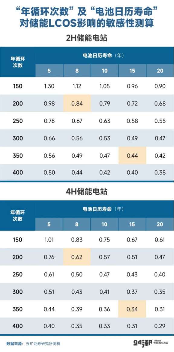 在上文100MW/400MWh储能电站模型的基础上,通过对核心参数的敏感性分析,发现对LCOS影响较大的另外两个变量是 “年循环次数” 和 “电池日历寿命”。对于2H储能电站,若年循环次数从200次上升至350次,电池日历寿命从8年上升至15年,LCOS可以从0.84元下降至0.44 元;对于4H储能电站,LCOS则可以从0.62元下降至0.34元。