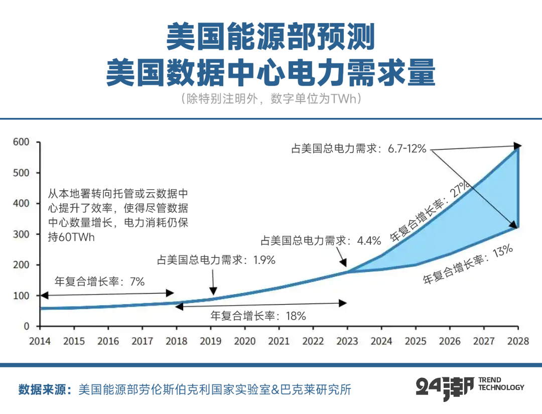 美国能源部的研究显示,该国数据中心用电量已从2014年的58TWh上升至2023年的176TWh,占国家电力消耗的4.4%,预计到2028年,将激增到325-580TWh,占国家总用电量的6.7%-12%。