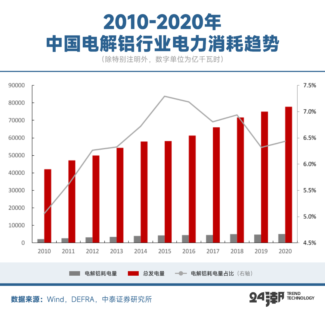 要知道,电解铝是人类工业时代不折不扣的 “耗电大户”,我国每年几乎要拿出7%的电量来进行电解铝生产,每炼1吨电解铝需耗13600kw/h直流电(接近1.4万度)。