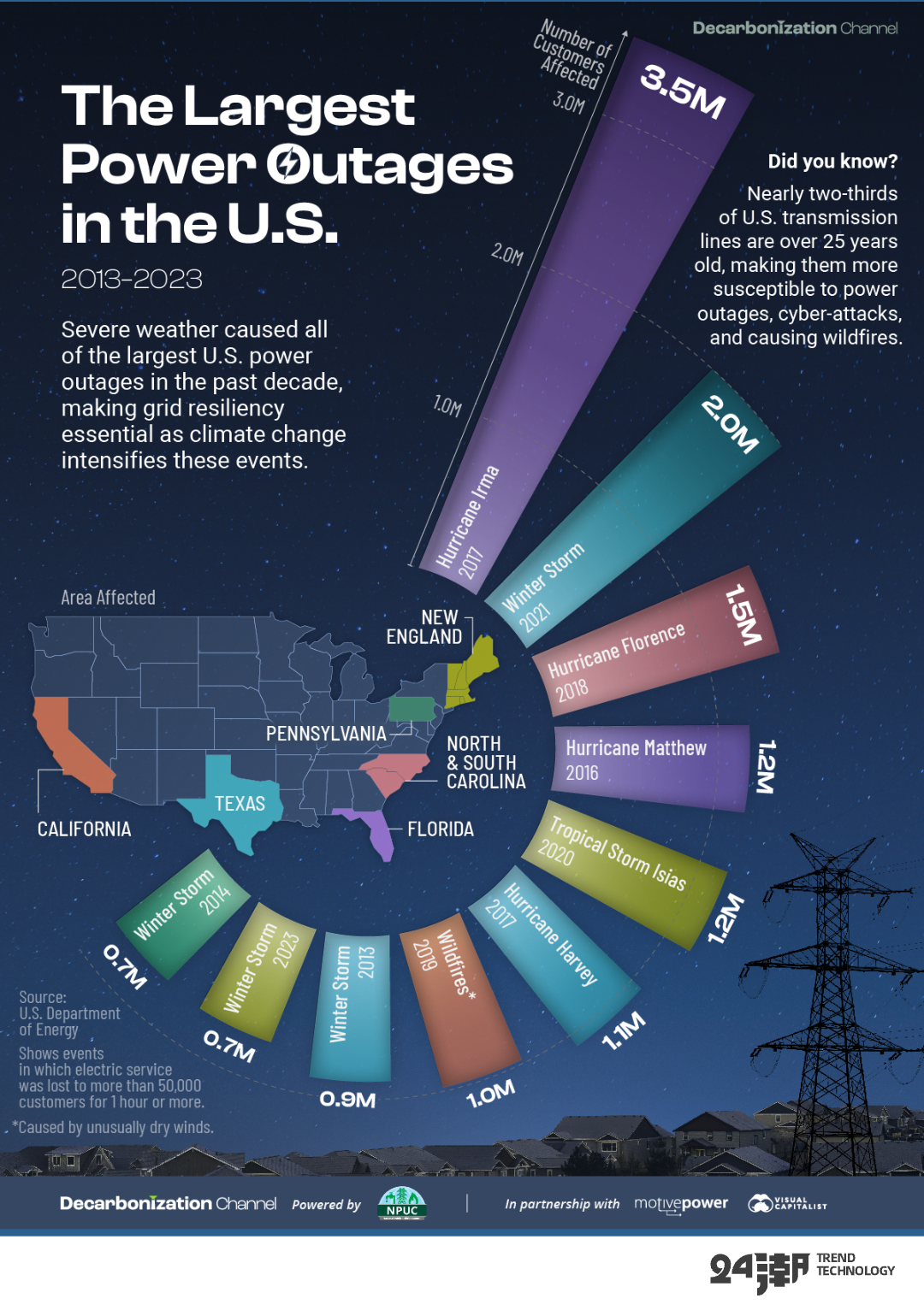 根据美国能源部数据,2013年之后的十年间,美国爆发了10次大停电事件,平均一年一次,输电等基础设施的脆弱性可见一斑。