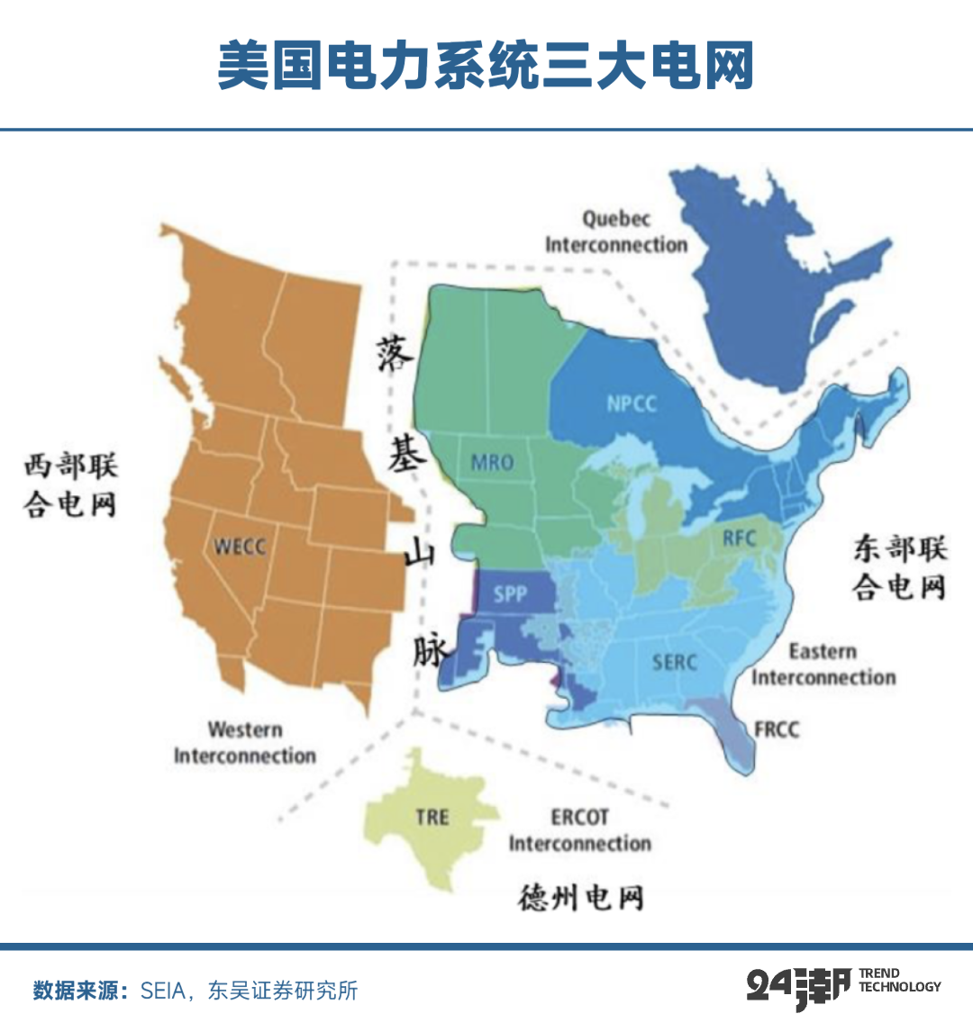 囿于地形限制,美国形成东部煤炭天然气、西部水力、南部德克萨斯天然气发电的三大电网体系,中西部及东南部缺少电网分布。三大电网彼此互联有限,各州能源政策独立,未形成全国性的电网。