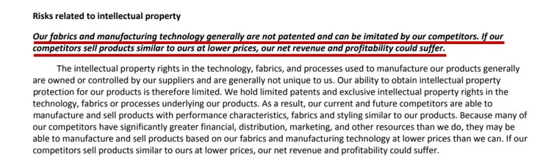 lululemon在财报风险提示中承认,“我们的产品在面料和生产工艺上通常没有专利,竞品可以仿效,如果竞品采用更低的价格销售,对我们的营收和利润会产生影响。”