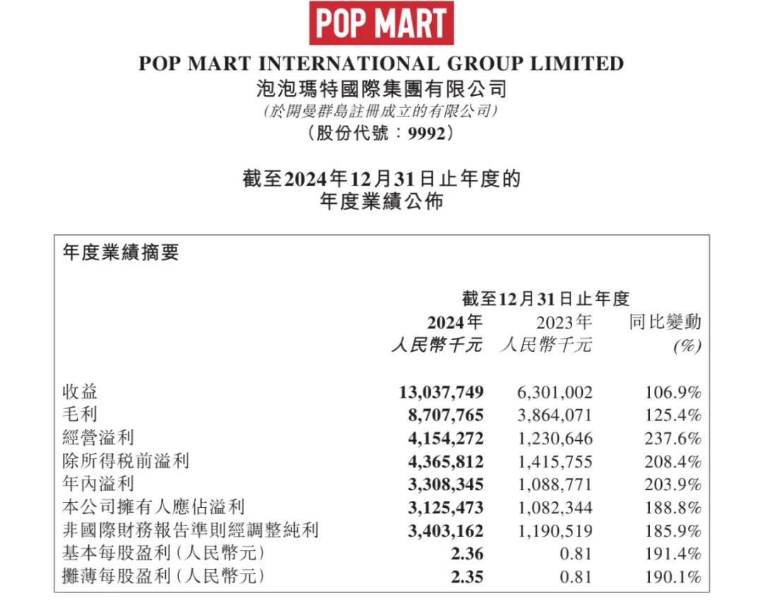 而在泡泡玛特与艺术家,艺术家与消费者的“合谋”中,潮玩这门生意的增长,自然也水到渠成。2024年,仅Molly这一个IP,就为泡泡玛特带来了20.9亿元的营收,相较前一年增长105.2%,增长仍在持续。