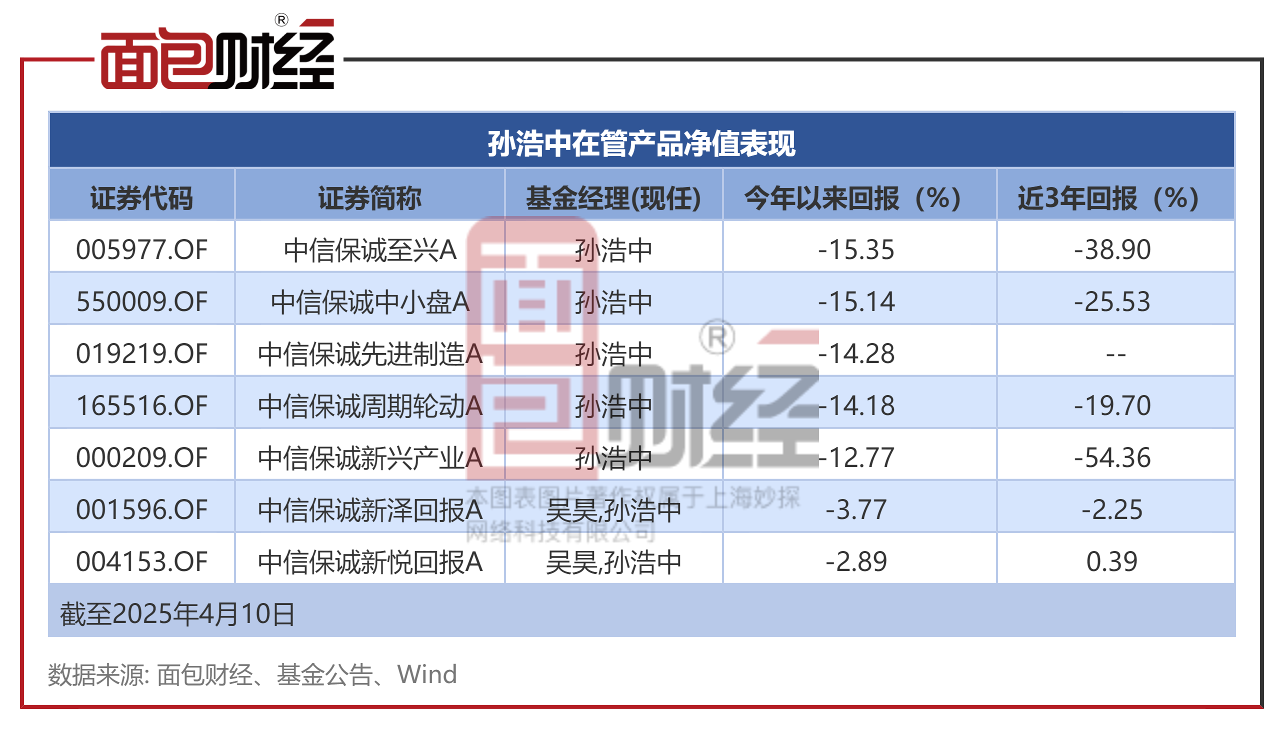 根据不完全统计,截至目前,孙浩中在管产品主要有7只,合计管理规模超过30亿元。截至2025年4月10日,孙浩中在管产品中,5只年内净值下跌超过10%,包括中信保诚至兴A、中信保诚中小盘A等。