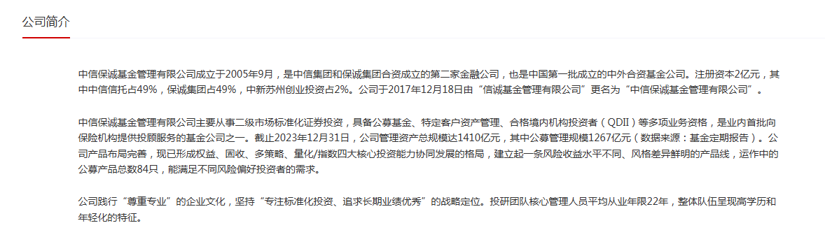 公开资料显示,中信保诚基金管理有限公司成立于2005年9月,是中信集团和保诚集团合资成立的第二家金融公司,也是中国第一批成立的中外合资基金公司。