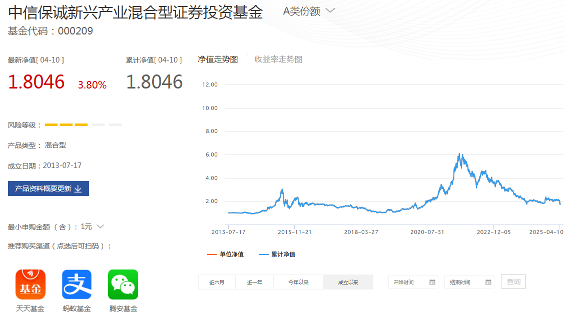 中信保诚新兴产业混合A作为曾经的"百亿爆款",在2019-2021年连续三年斩获超40%的收益后,却在2022年开启持续下挫通道。