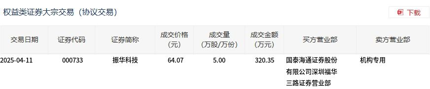 振华科技今日大宗交易平价成交5万股,成交额320.35万元