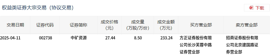 4月11日,中矿资源大宗交易成交8.5万股,成交额233.24万元,占当日总成交额的0.97%,成交价27.44元,较市场收盘价28.88元折价4.99%。